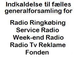 Serviceradio. Week-end Radio. Radio TV Reklame. Radio Ringkøbing Fonden. Afholder ordinær generalforsamling sammen med Radio Ringkøbings Lytterforening. Dagsorden for alle foreninger er i følge vedtægterne. |
